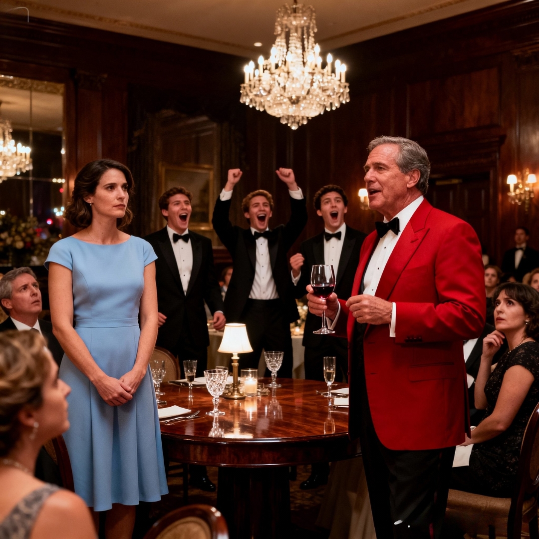 The words cut clean through the laughter, sharp as a trumpet note. The room froze. My father inhaled at the wrong time, Bordeaux spraying into a red fan across the white linen. He coughed, sputtered, color draining as the arithmetic reached him: the woman he mocked, in front of 200 guests, was the same woman these men would stand to salute.
