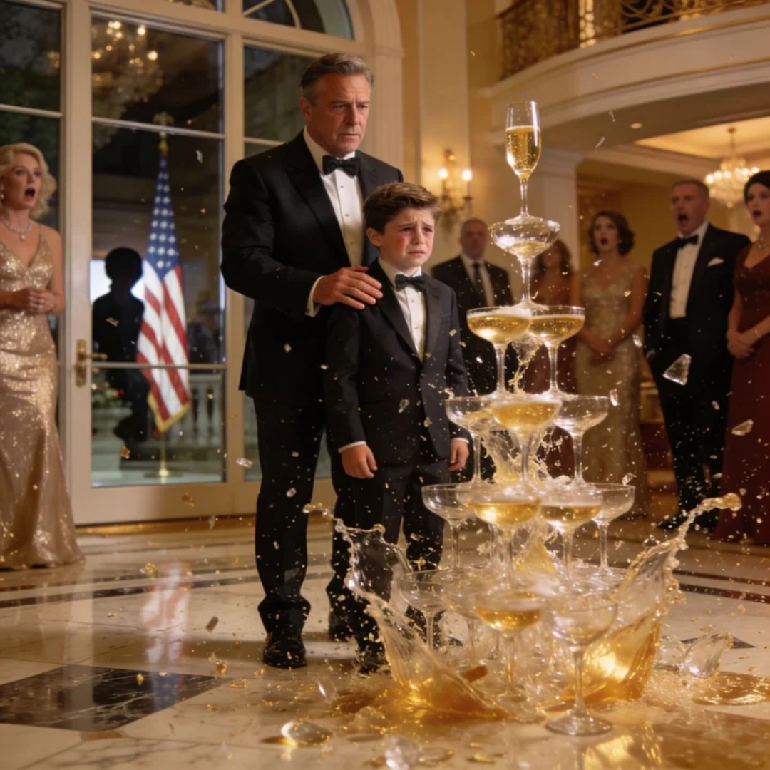 The champagne tower exploded like a glittering avalanche of broken stars, crystal and gold raining down in a slow, catastrophic shimmer across a Persian rug that probably cost more than my first house.