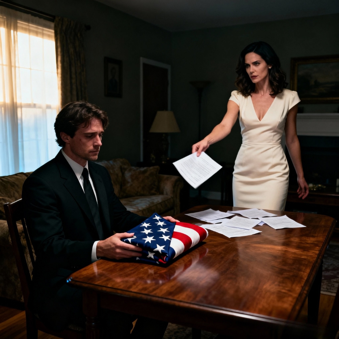 The apartment felt colder than it had any right to be. The heater rattled in the corner like it was dying. I dropped the folded flag on the couch, its dark blue fabric soft against the threadbare cushions, and sat at the kitchen table surrounded by bills.