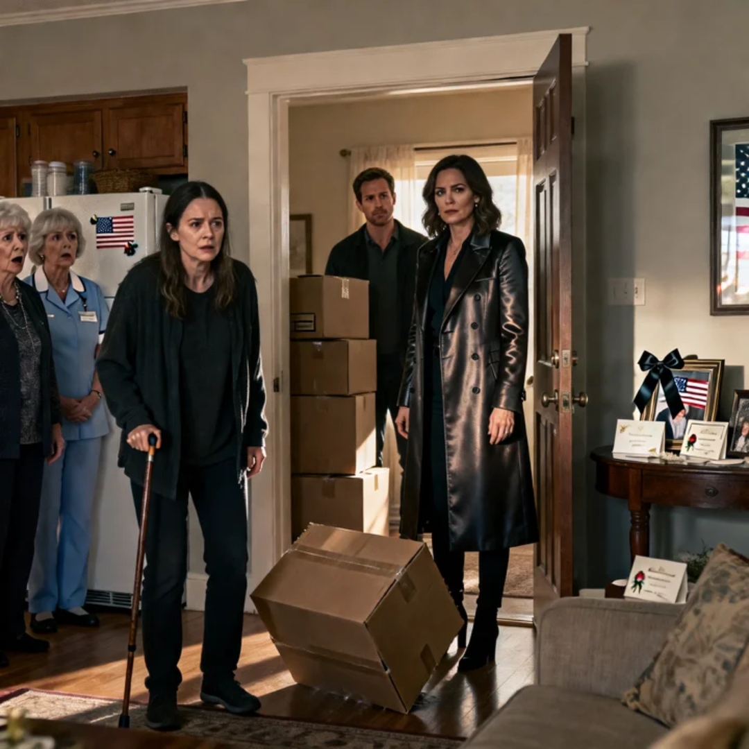 The first box hit the hardwood like a verdict—hollow, brutal, loud enough to make the framed family photos tremble on the wall.