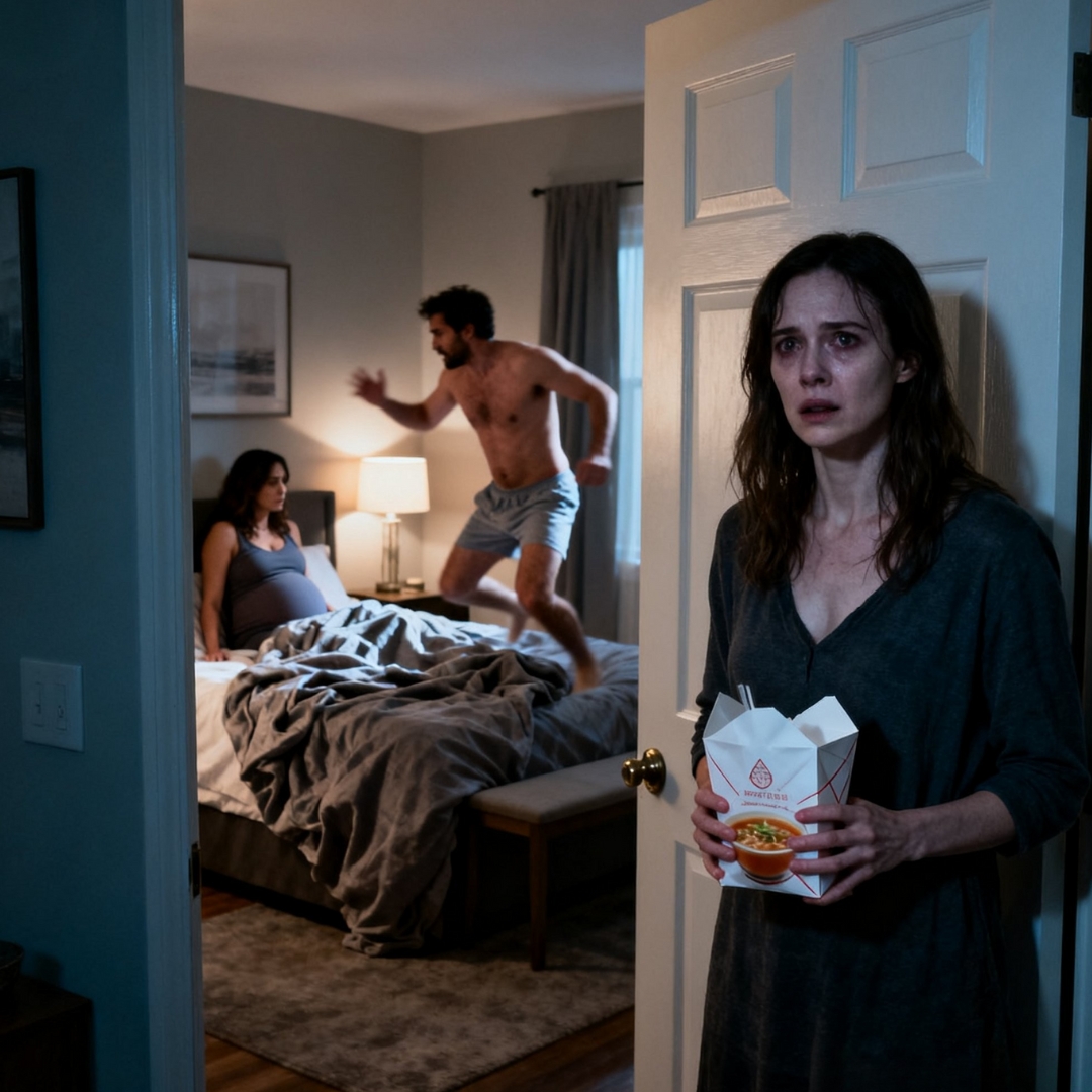 The soup bag slipped from my fingers and hit the carpet with a soft, ridiculous thud. The scent of ginger and chicken filled the room, warm and domestic, like a cruel joke.