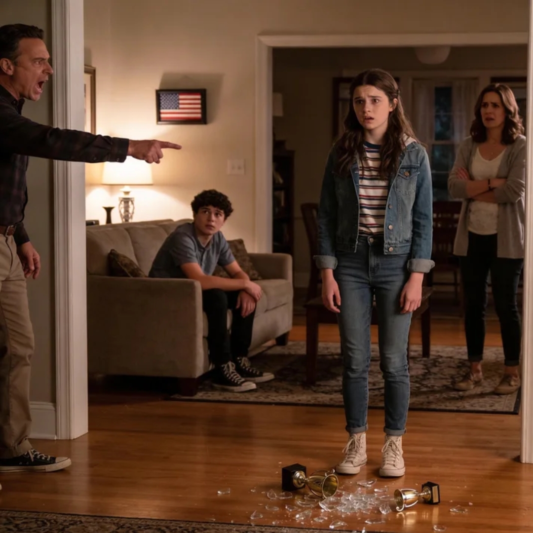 I stepped into the living room and saw the eagle scattered across the hardwood floor in a thousand glittering shards. My father stood over it, face flushed dark red, arms folded. My mother hovered near the doorway, pale and silent. Ryan sat on the sofa with his elbows on his knees, staring at the floor with the solemn expression of someone already preparing to be praised for honesty.