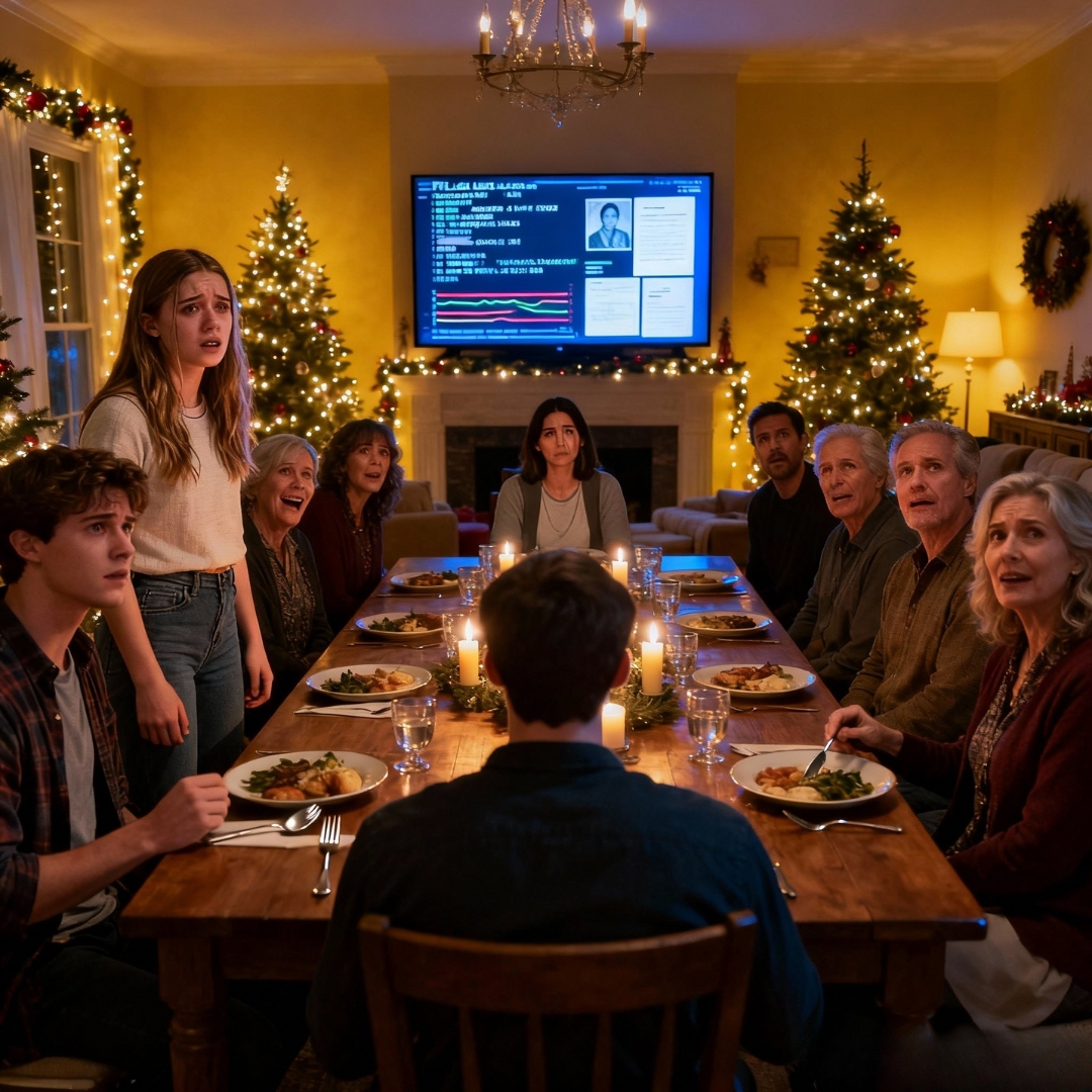 By the time the insult left her mouth, every fork on the table was already suspended in midair, catching the glow of American Christmas lights like tiny silver streetlamps in a storm.