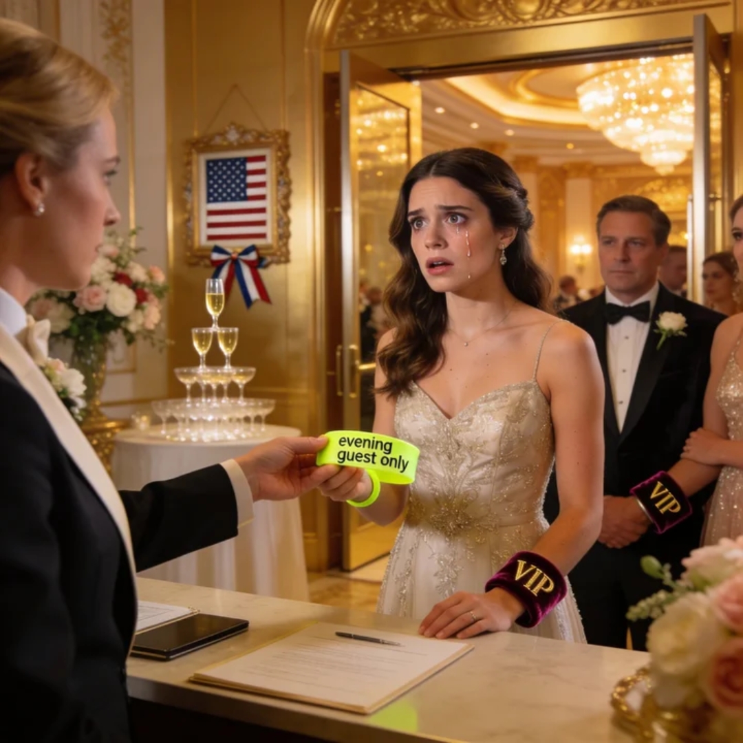 It was neon yellow—cheap, thin, humiliatingly bright—the kind of plastic strip you’d get at a county fair in Ohio or a low-budget concert off the Jersey Turnpike, not at a black-tie wedding in a restored historic hotel where the champagne was French and the flowers had been flown in from California. The wedding coordinator held it out to me without meeting my eyes, already reaching for the next guest on her list. Ahead of me, people were being handed thick velvet-lined gold bands that opened the doors to the main ballroom, the formal dinner, the speeches, the photographs, the center of the celebration. Mine said, in bold black letters: EVENING GUEST ONLY.