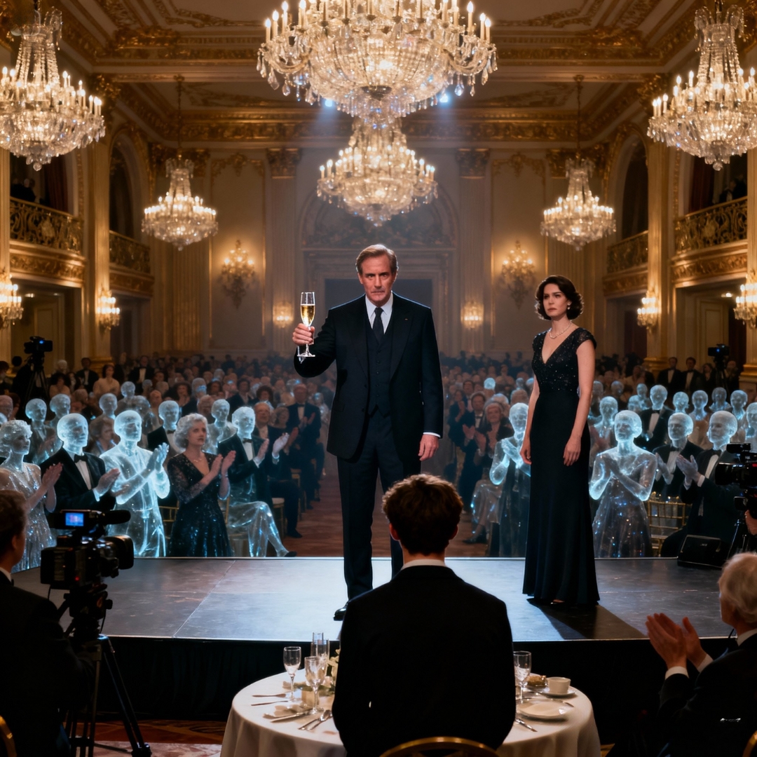 He tapped his glass. The chandeliers dimmed slightly, throwing all the light toward him. The giant LED wall behind him shifted from the highlight reel to a live shot of his face.