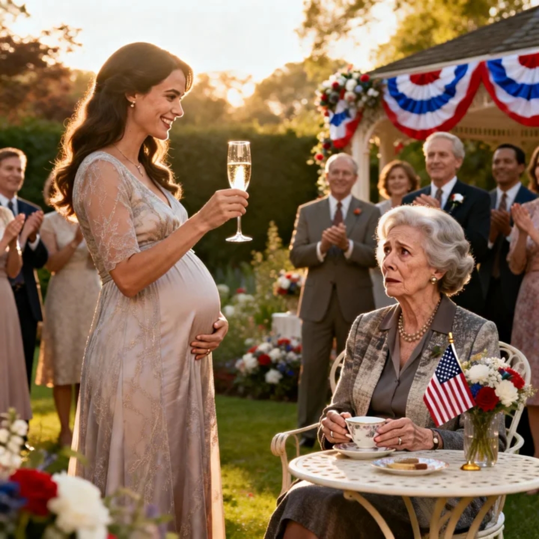 “Let’s hear from our mother-to-be,” she announced, voice carrying smoothly across the lawn.