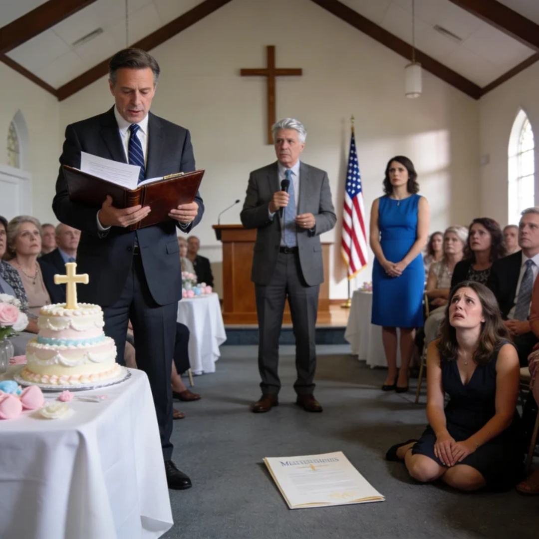 The room at St. Catherine’s Parish Hall was glowing with soft light and pastel lies—white tablecloths stretched tight over folding tables, balloons bobbing in innocent pinks and blues, and a tiered cake crowned with a fondant cross so perfect it looked printed. Forty-five guests packed the private room, the kind of crowd you only get in America when a family has been in the same town long enough to collect neighbors, church friends, and distant cousins like extra ornaments for big occasions.