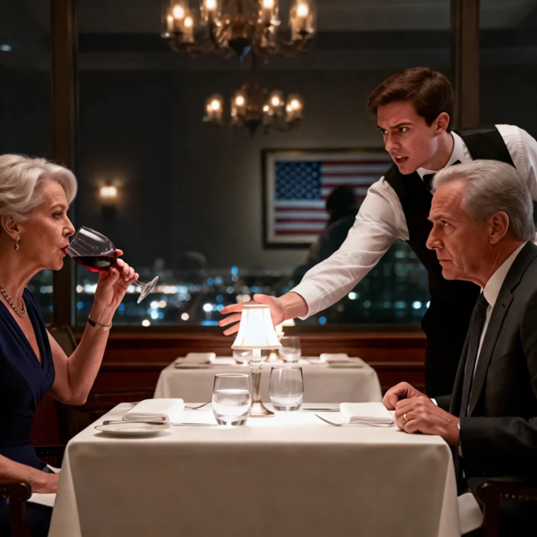The waiter’s face was pale beneath his practiced smile, his eyes locked on mine with an intensity that had nothing to do with customer service. Then his gaze flicked—fast, sharp—toward my husband sitting across from me.