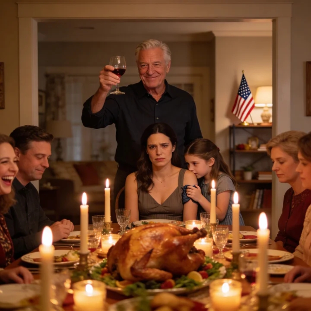 The fork slipped from my father’s hand and rang against the china like a tiny bell announcing disaster. For a moment, the sound echoed across the long Thanksgiving table, across fourteen stunned faces, across the quiet suburban dining room where the smell of roasted turkey and cinnamon candles hung in the air.