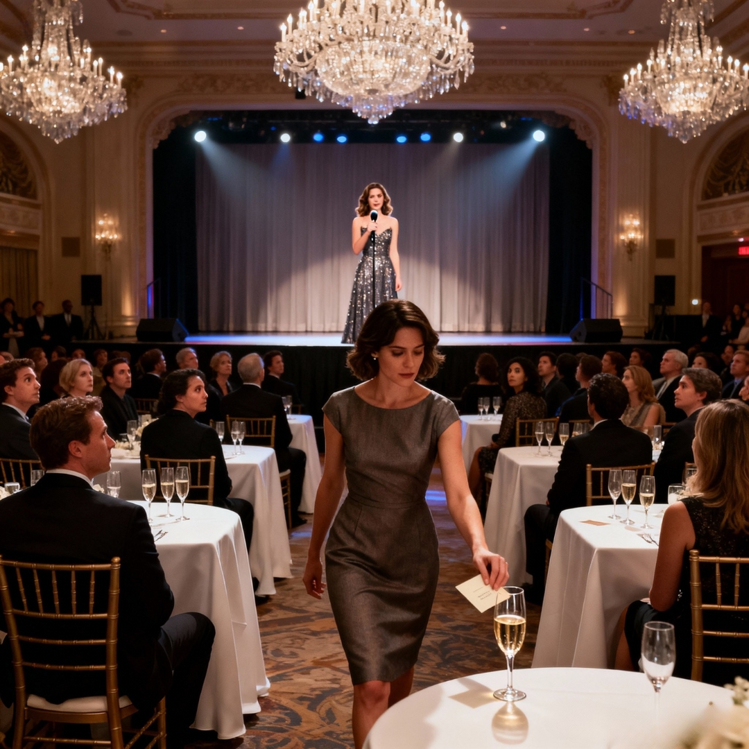 Chairs half-turned. Forks suspended over plates. Lights trembled on crystal. About two hundred pairs of eyes turned toward me, like a spotlight I’d never asked for suddenly burned at my back.