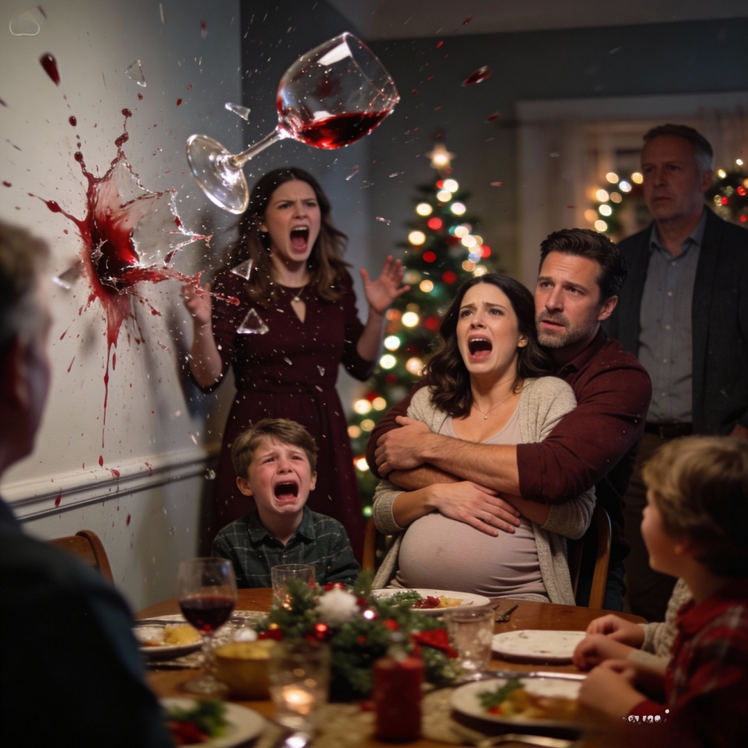 The wineglass didn’t shatter so much as explode—a bright, violent burst of red and crystal against my parents’ dining room wall—like Christmas itself had finally had enough.
