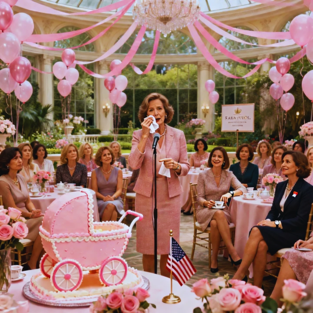 Pink balloons, pink streamers, pink roses on every table, and a massive cake shaped like a baby carriage that cost more than my first car.