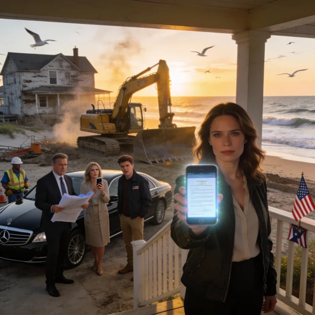 Down in the gravel driveway, my family moved like they were directing a movie. Clipboards. Phones held up in perfect angles. A Mercedes idling like an expensive predator. A group of men in heavy jackets with a demolition company logo stamped across their backs, rolling out orange cones as if they owned the morning.
