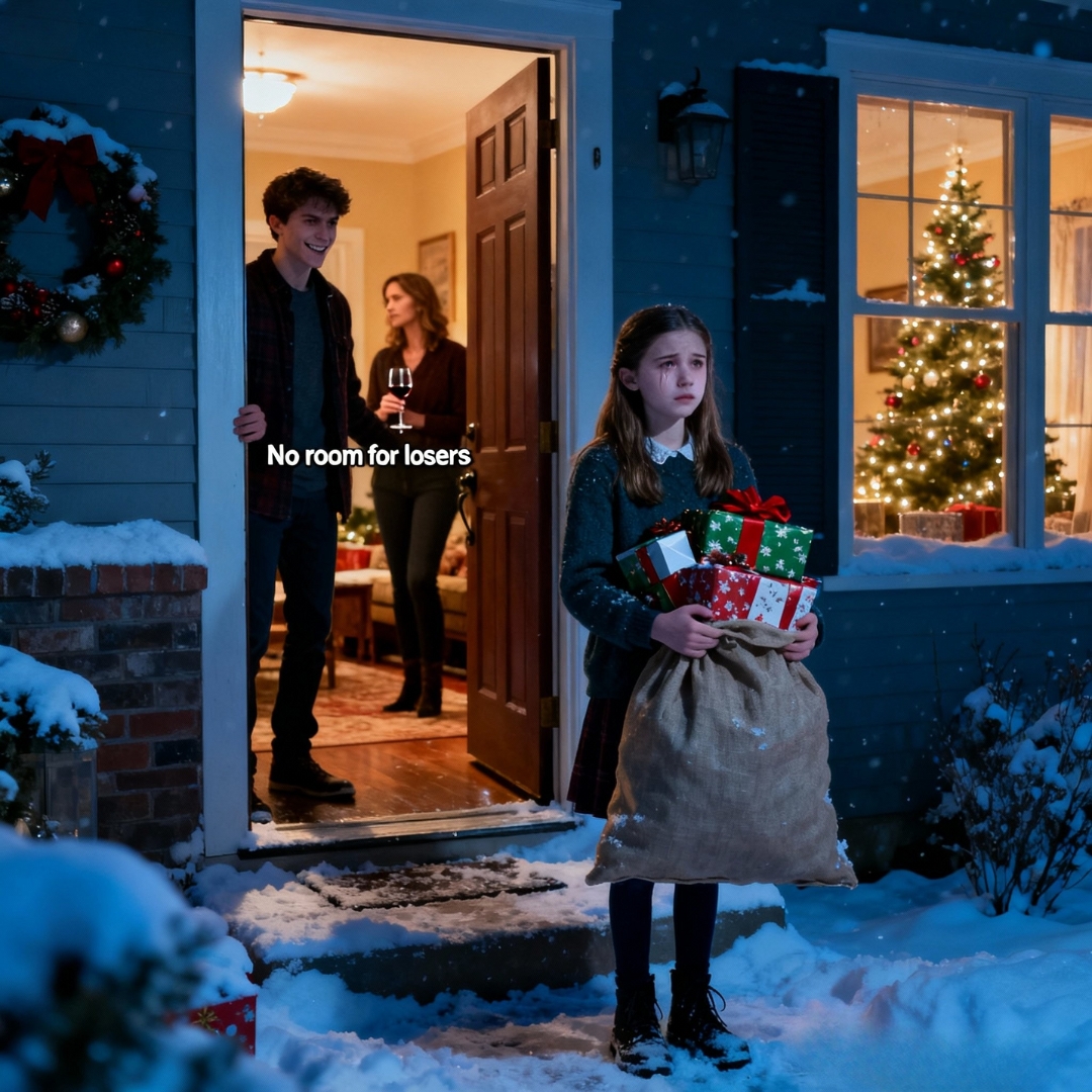 I clutched the bag of gifts tighter, felt the thin plastic handles bite into my palm, then turned and walked down the front steps as the snow thickened. Behind me, the door closed with a soft, definitive click. The porch light spilled across the yard like a spotlight following me offstage.