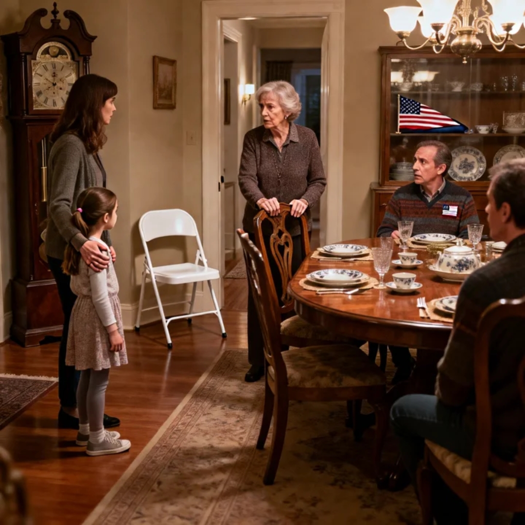 My mother stood there beneath the chandelier, the same chandelier that had watched generations of my family eat roast chicken and trade polite stories, and she pointed at that flimsy chair like she was assigning my daughter a sentence.