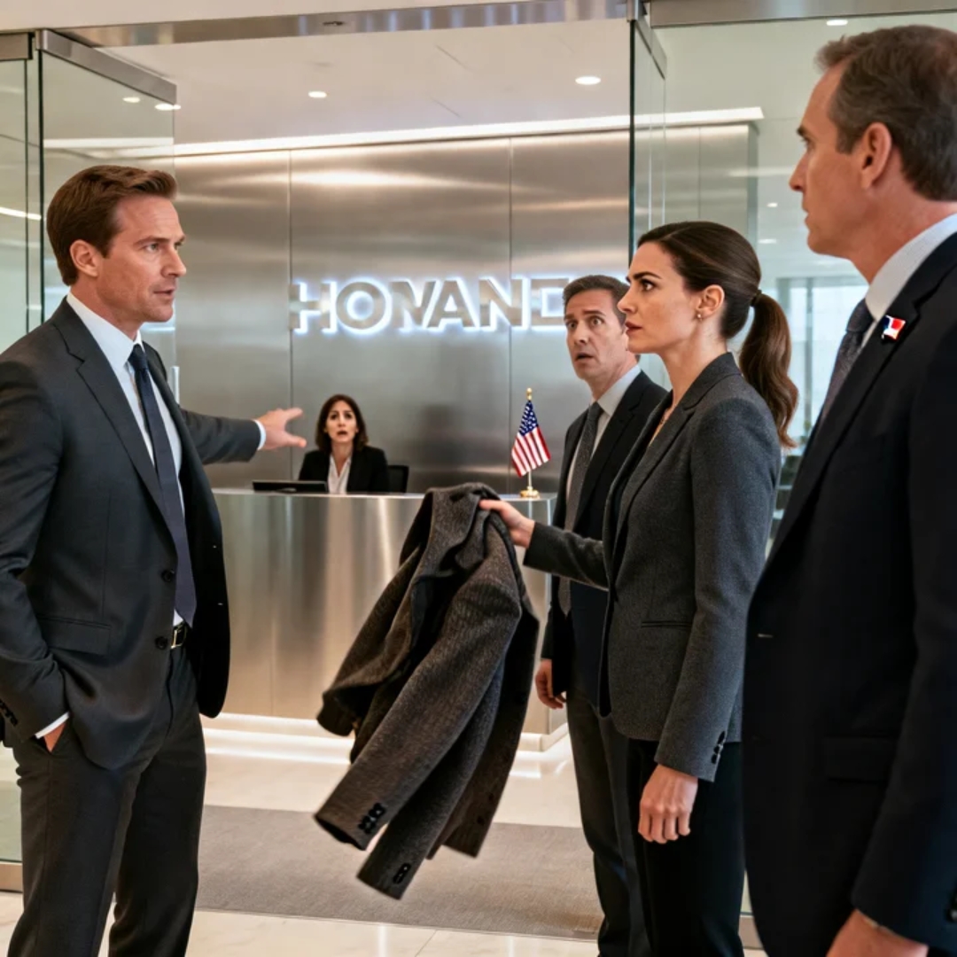 The brushed steel logo glowed like a promise. The reception desk was quiet. The chair where Garrett had stood—where he’d tossed his coat like he owned the room—sat empty.