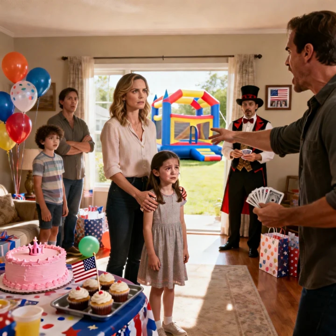 The magician we’d hired—some guy from Craigslist with a tidy bow tie and a collapsible table—stopped mid-setup with a deck of cards in his hands, blinking like he was reconsidering every decision that brought him to a suburban living room on a Saturday afternoon.