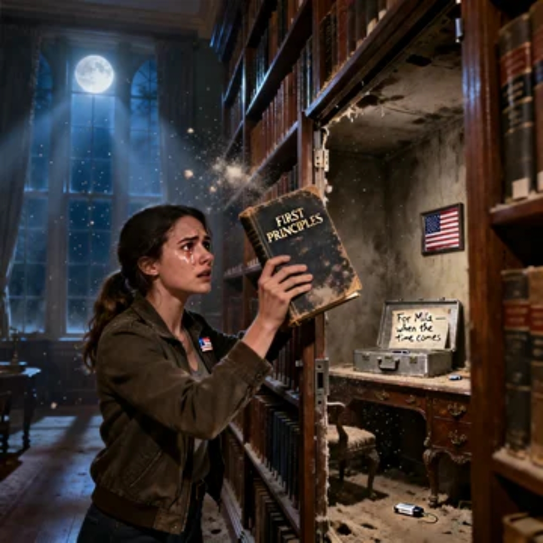 I stared at the gap behind the third bookshelf, where the wall should’ve been solid. Instead, there was a hidden door, oak-dark and sealed with forty years of quiet. My fingers tightened around the worn spine of the book I’d just pulled—First Principles—gold lettering catching the light.