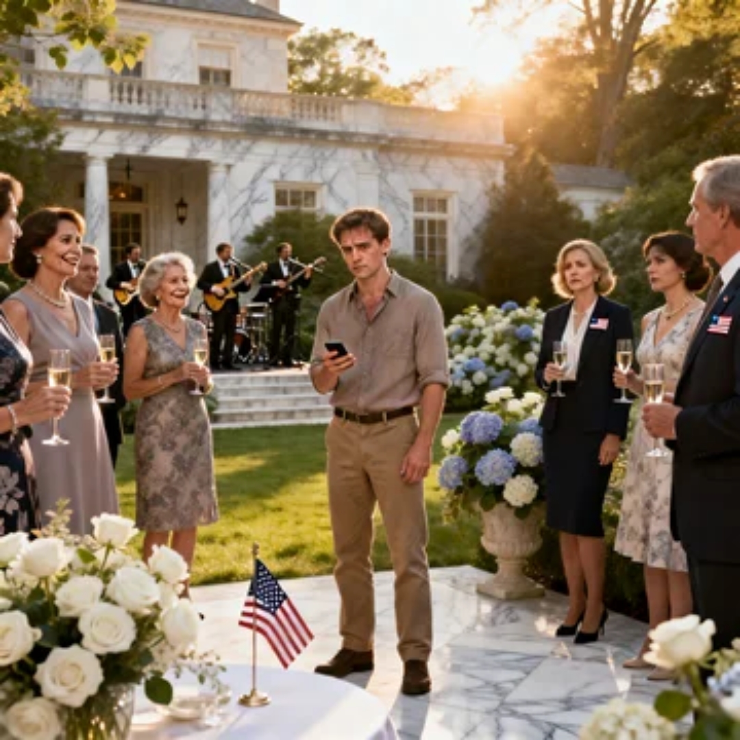 Through the French doors, the party was already alive. Bright, curated, effortless. Women in designer dresses that looked soft and expensive. Men in crisp blazers and khakis, wearing the relaxed confidence of people who confuse inheritance with talent. Champagne flutes flashed in the afternoon sun like tiny trophies.