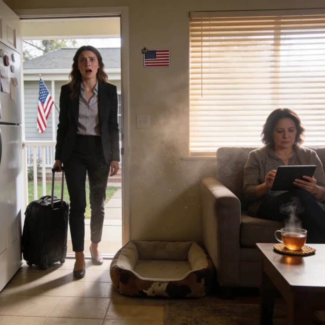 I stood in the entryway with my rolling suitcase still upright beside my leg, Chicago airport grime still on my shoes, my head aching from three straight days of spreadsheets and client meetings and fluorescent conference rooms. I’d been counting the hours until I could bury my face in Rusty’s golden fur and let my nervous system remember what safety felt like.