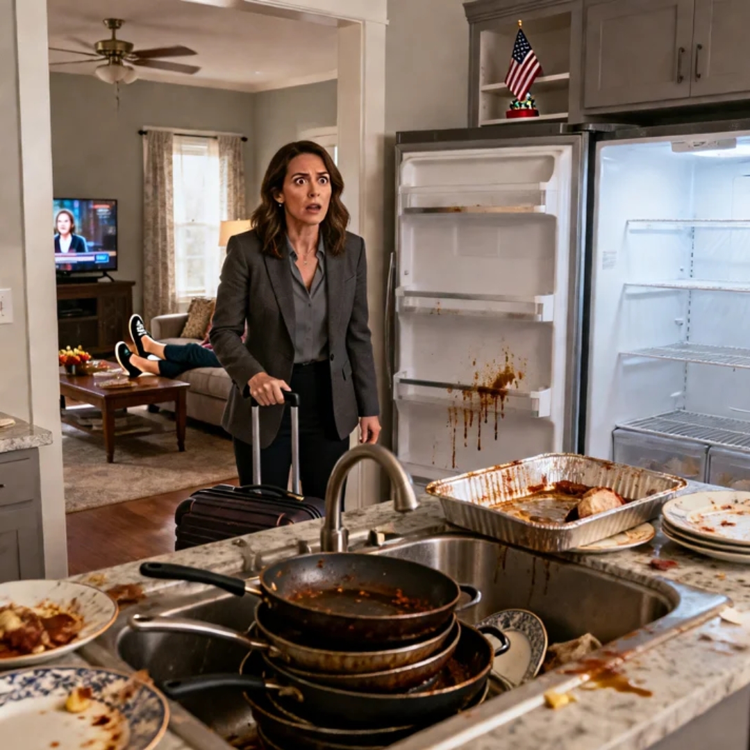 Grease splattered up the backsplash like a crime scene. Pans were stacked in the sink in a dangerous tower that threatened to collapse at any second. My grandmother’s china plates—my grandmother’s—were crusted with dried gravy and smeared cranberry sauce like someone had deliberately tried to ruin them. The fridge door hung slightly open, as if even the refrigerator was too shocked to close properly.