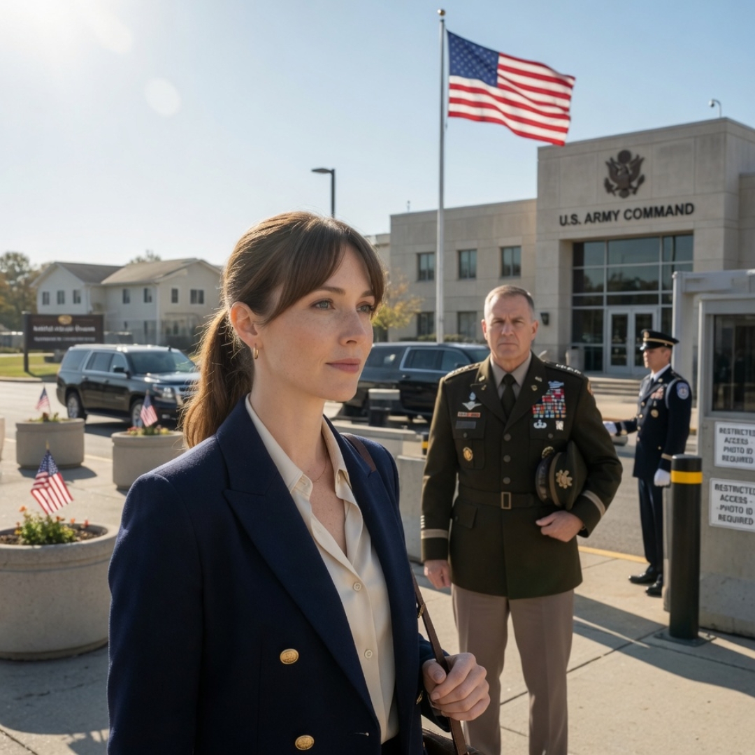 I turned and saw her coming through the glass doors from deeper inside the base, one hand resting lightly on a folder tucked beneath her arm. Early thirties, maybe. Composed. Dark hair pinned neatly. The kind of elegant restraint that costs money, time, and practice. She didn’t look around because people who belong do not look around. They let the room prove it for them.