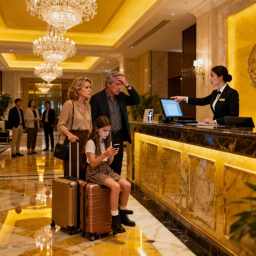 Instead, the first thing they saw was a front desk clerk in a marble lobby, shaking her head beneath a chandelier big enough to light half of Manhattan.