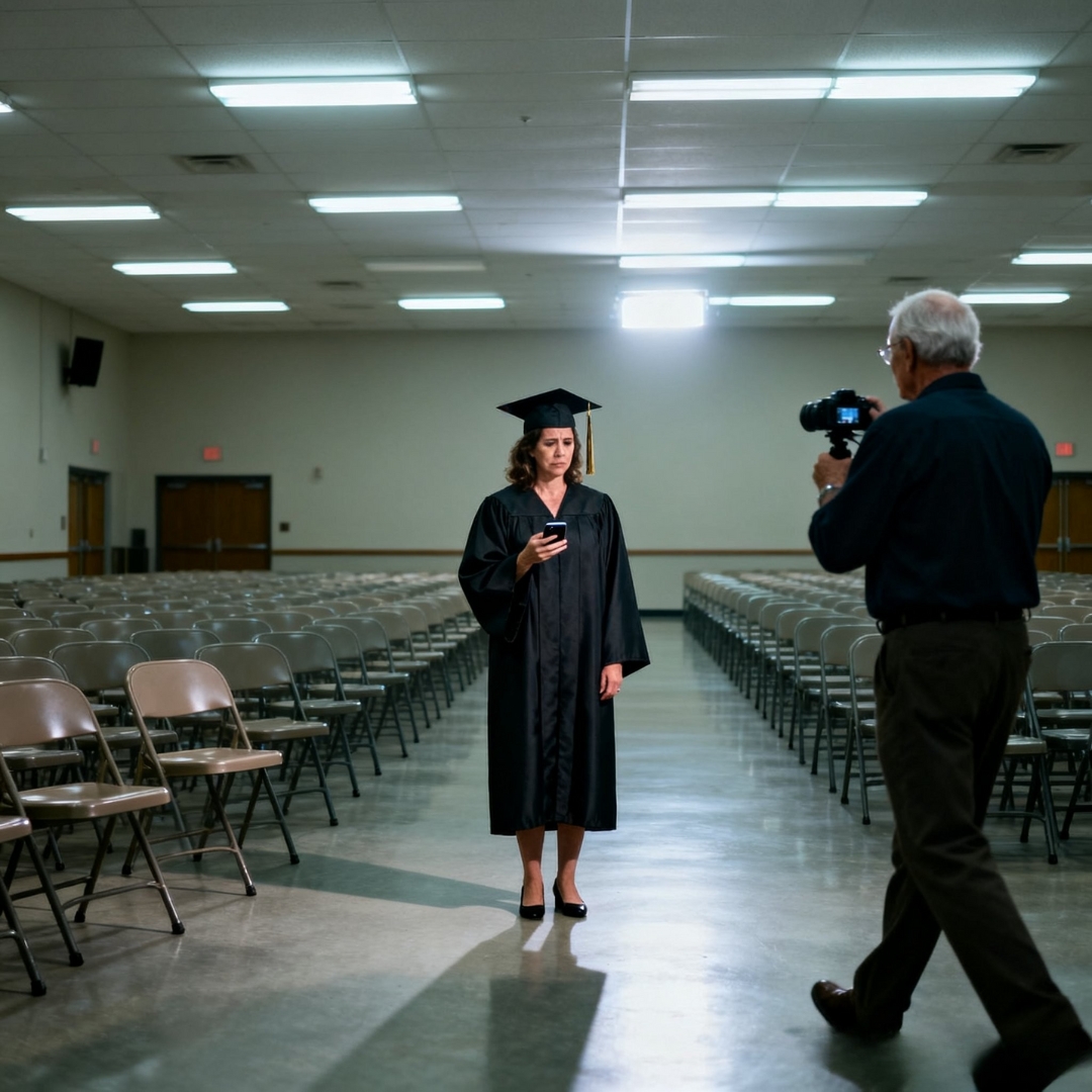 They bounced off the polished floor of the small campus hall, sharp and lonely, each step circling back to me like an accusation. My uncle held the camera up high, turning slowly, narrating out of habit more than intention. “Ladies and gentlemen,” he said, forcing cheer into his voice, “a graduation with zero guests.” The lens swept across rows of empty folding chairs I had paid for myself, chair after chair untouched, perfectly aligned, unbearably silent. Under the fluorescent lights, the space looked harsher than it had any right to be, like a courtroom waiting for a verdict.