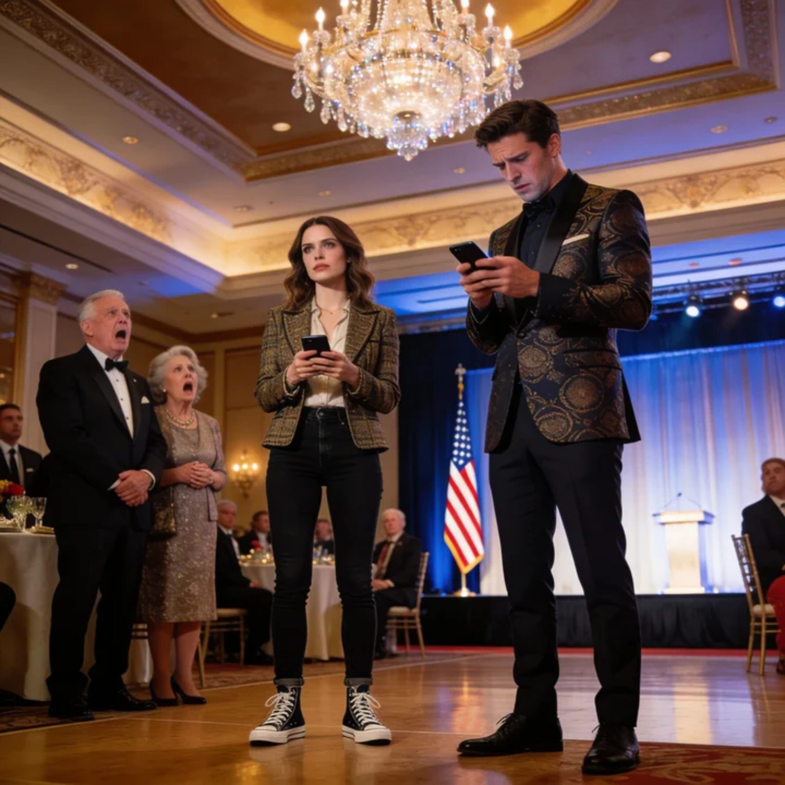 The chandelier light hit the spilled champagne like shattered glass, and for one suspended second the entire ballroom looked as if someone had dropped a diamond and cracked the night open.