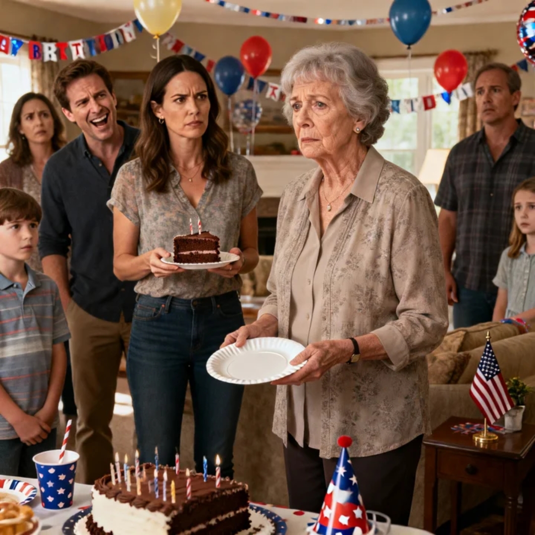 The first slice of chocolate cake hovered in the air for one bright, ridiculous second—frosting glistening under the living-room lamp—before my daughter-in-law snapped it away from me like I was a child reaching for a hot stove.