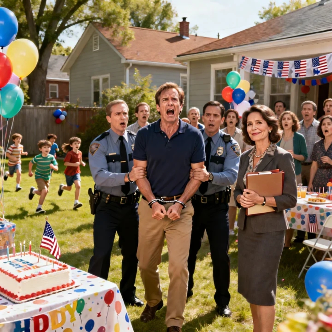The handcuffs clicked in my daughter’s backyard with the same bright finality as a camera shutter, and for one impossible second the whole party—fifty guests, a balloon arch from Target, a princess cake sweating under July humidity—froze like a paused screen.