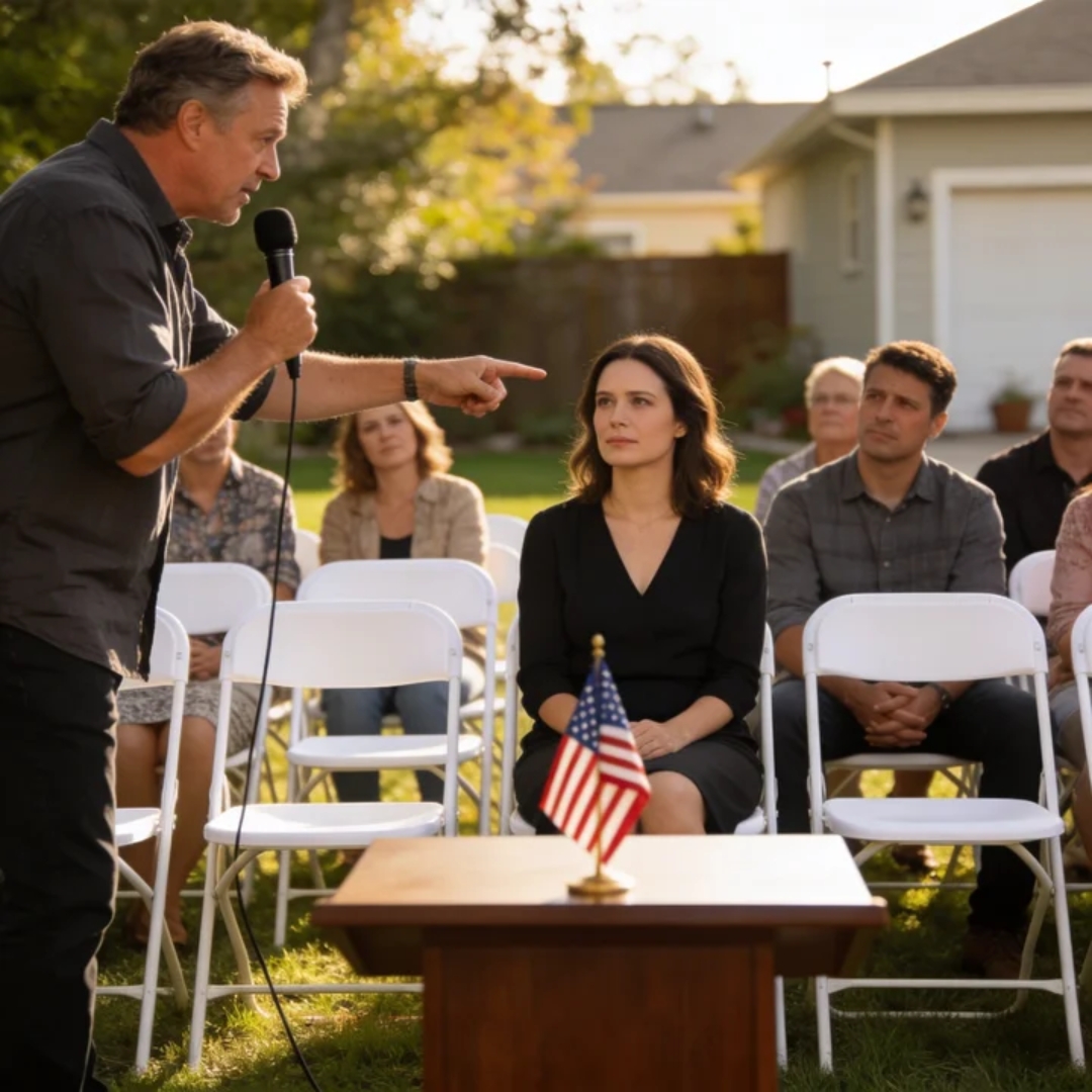 When he tapped the microphone, the soft feedback hum cut through the chatter. Conversations died mid-sentence. Chairs creaked. Someone coughed.