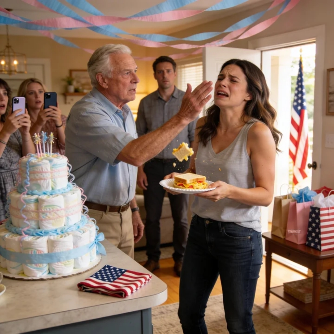 One second I was smiling too hard in a living room full of pastel streamers and tiny pink onesies, balancing a paper plate of pimento-cheese sandwiches like it was a normal Saturday in America. The next, my father-in-law’s palm cracked across my cheek in front of two dozen witnesses, and the world narrowed to a hot flash of pain, the taste of salt and shock, and the sudden, terrifying awareness that I was carrying a secret he didn’t know existed.