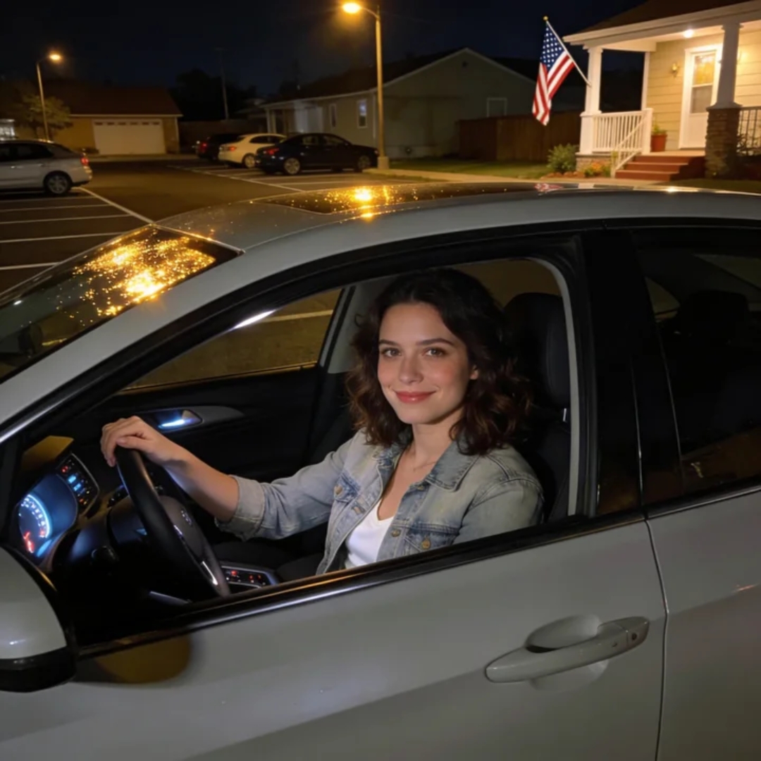 I sat in the driver’s seat of my new car, engine off, hands resting on the wheel, staring at my reflection in the windshield. The parking lot was almost empty, just a few scattered vehicles under flickering streetlights, somewhere off a suburban road that smelled faintly of gasoline and late summer heat.