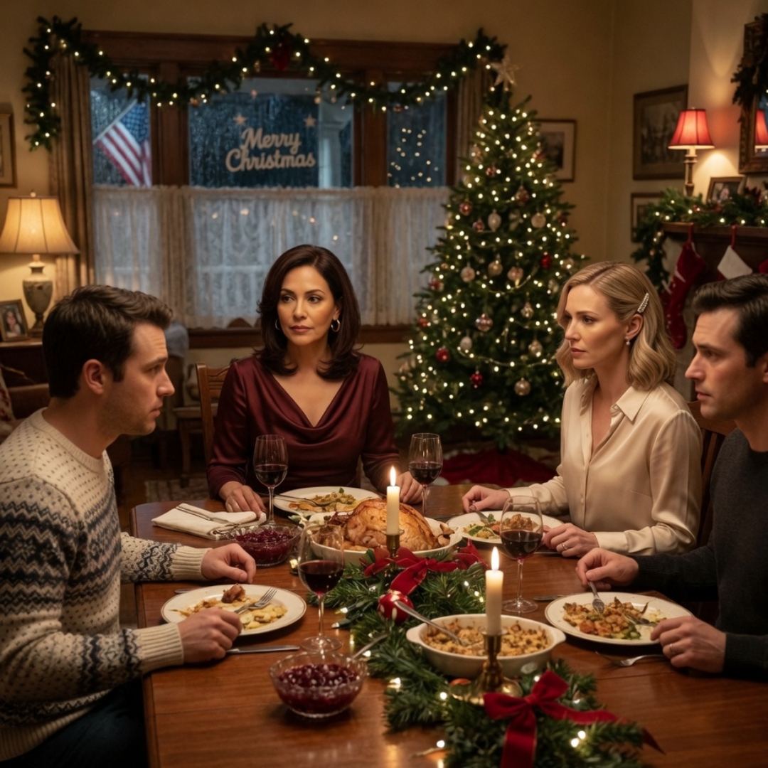 That is the strange thing about family dinners in America, especially at Christmas: even when the emotional foundation is cracking right under the table, people keep passing bread. They refill water. They ask about traffic. They compliment the salad. They cling to ritual with the blind faith of people who think enough normality can still drag disaster back into the realm of manners.