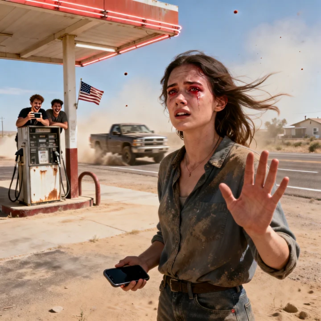 The station sat alone in the middle of nowhere, the kind of place you only see when you’re low on fuel and out of options. One crooked pump. A flickering fluorescent light that buzzed like it hated its job. A bathroom door covered in old stickers and warnings. Beyond it—nothing. No houses. No hotel signs. Just a long ribbon of road cutting through sunburned land.