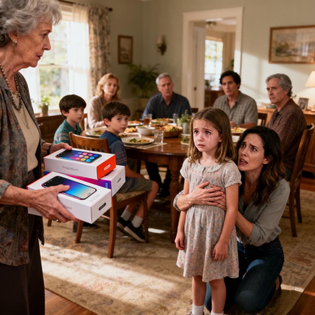 She stood in the middle of her grandmother’s living room, hands clasped together, eyes darting from face to face as excitement drained into confusion. Around her, three children tore open identical boxes, plastic wrapping crackling, voices overlapping as brand-new iPhone 17 Pro Max screens lit up the room like tiny suns.