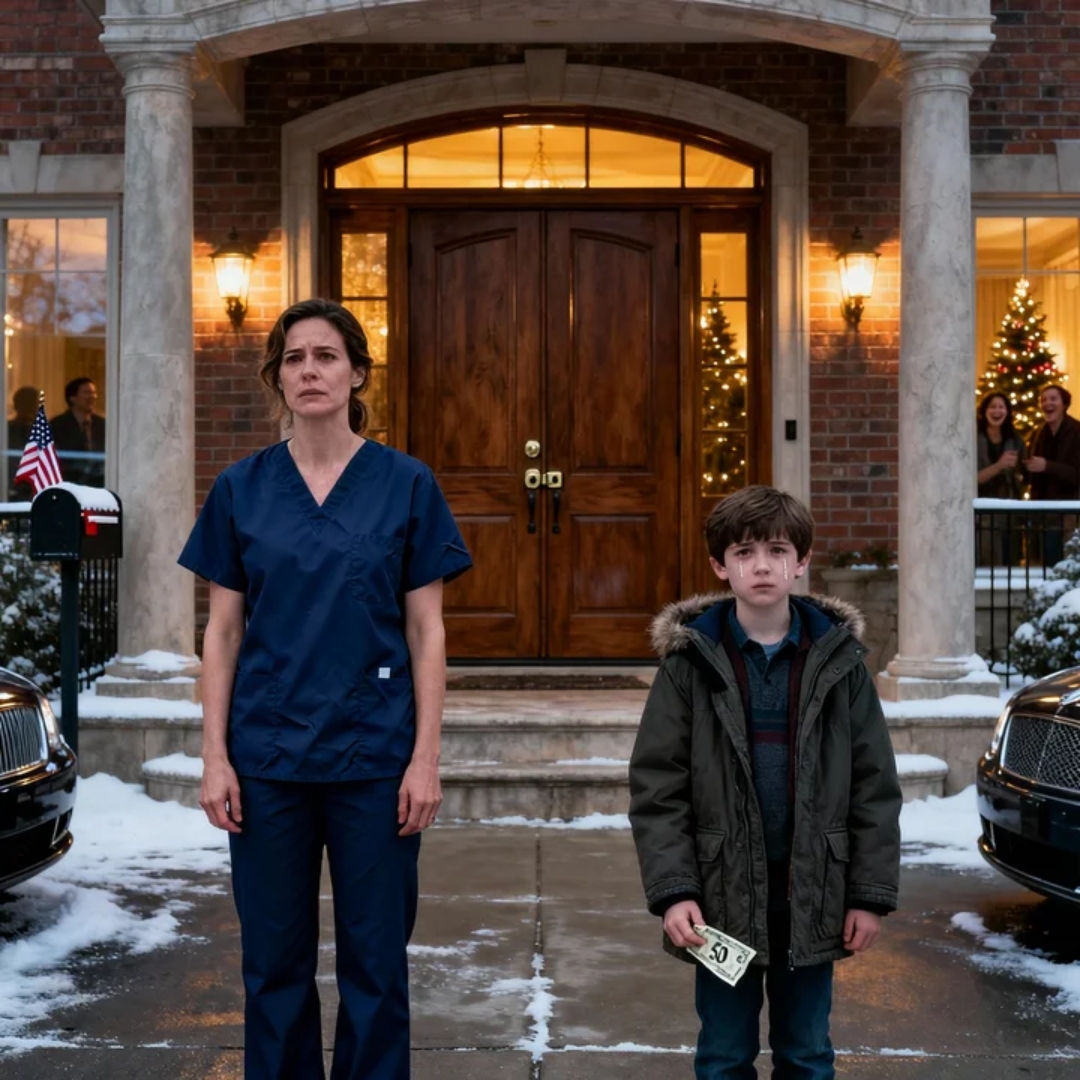 The deadbolt clicked like a verdict, and for a second the porch light turned my son’s tears into something glittery and cruel—like the house itself was dressed for Christmas and laughing at us.