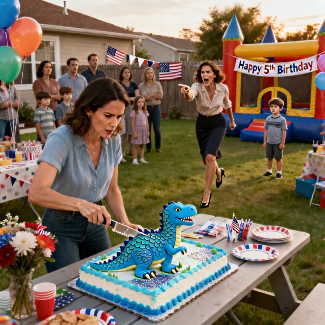 The first slice of cake split the dinosaur’s blue fondant jaw clean in half—and that’s when Jessica’s scream ripped through my backyard like a firework gone wrong.