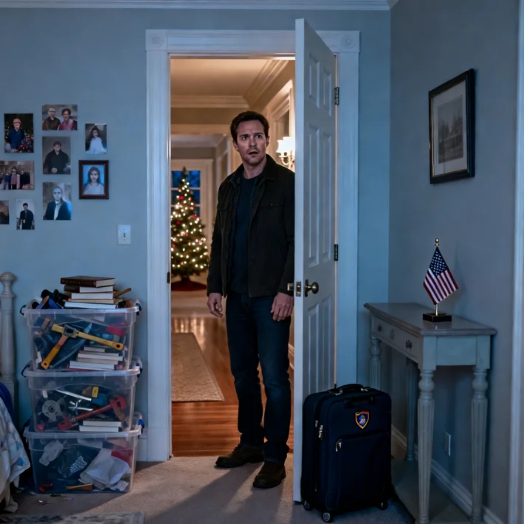 I was standing in the upstairs hallway of my family’s Saddle River colonial—the one with the circular driveway and the Christmas wreaths that cost more than my monthly shop rent—when I saw a stranger’s monogrammed luggage leaned against what used to be my bedroom door. The leather was expensive. The tag was embossed. And the message was clear: in this house, even a guest’s suitcase ranked above my history.