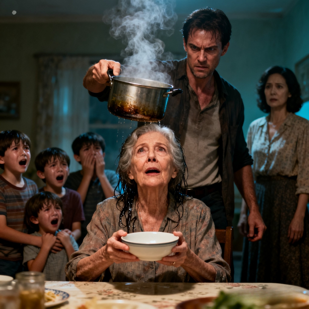 The first drop hit my forehead like a warning bell, warm and wrong, and for one suspended heartbeat I thought it was an accident—an overfilled ladle, a clumsy hand, a slip at the wrong time. Then the second wave followed, heavier, and I understood, in the way your body understands before your mind has the dignity to catch up, that my son was doing this on purpose.