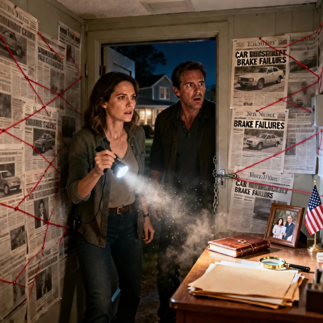 The room was maybe ten by twelve, but it felt smaller because the walls pressed in on you, crowded with proof. Strings of red thread connected headlines like a detective’s board. Margins were covered in tight handwriting. Dates. Names. Arrows. Circles. Notes that made my skin crawl.