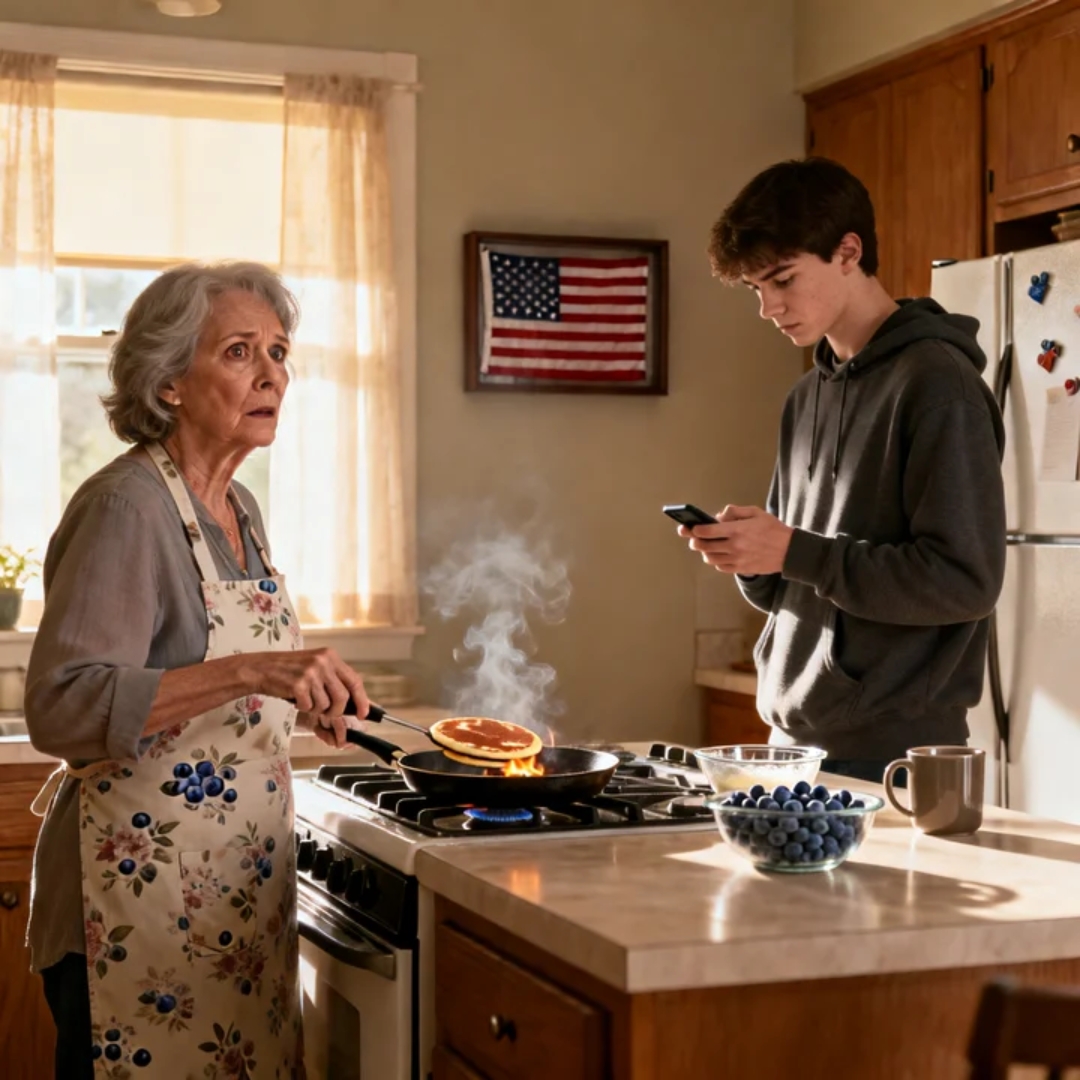 A perfect circle of batter—blueberries floating like tiny galaxies—burned black in the skillet while my hand hovered above it, frozen mid-flip, as if my body couldn’t accept what my ears had just heard. The kitchen smelled like sugar and smoke, like a childhood memory being set on fire.