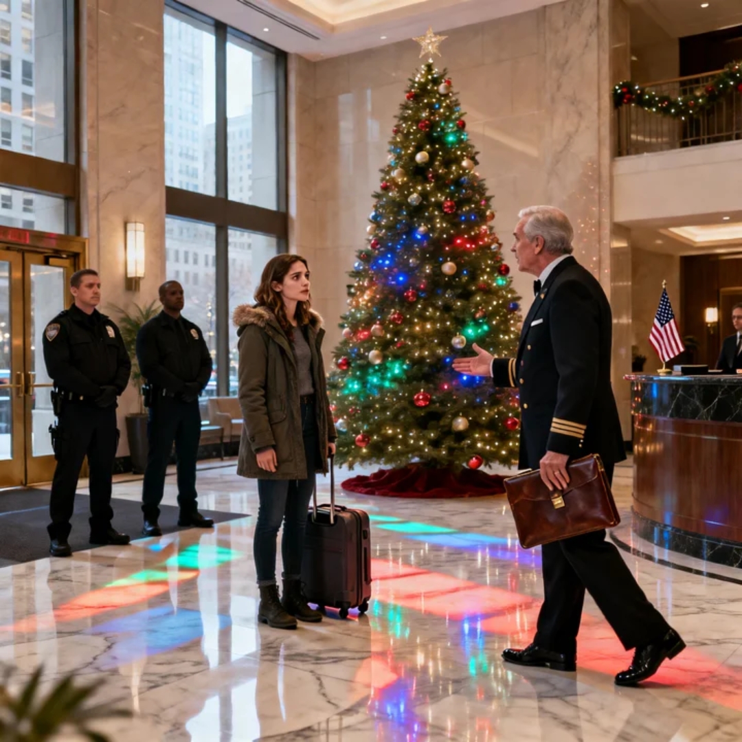 The Christmas tree in the penthouse lobby looked like it had been imported straight from a Beverly Hills movie set—twenty feet tall, dripping in crystal ornaments and gold ribbon, glowing so brightly it painted the marble floor in stained-glass colors.