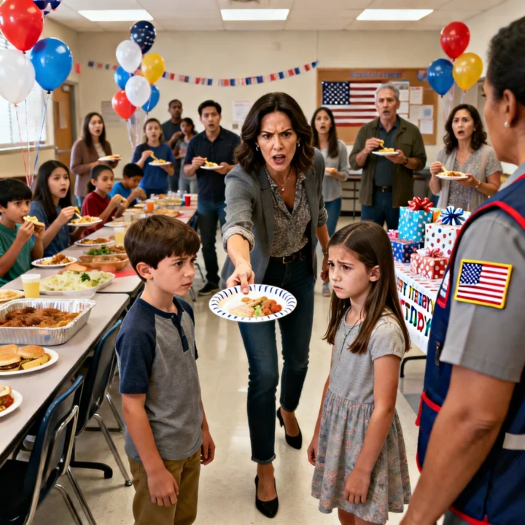 In the fluorescent glow of the community center—beneath a sagging “HAPPY BIRTHDAY!” banner taped crooked to beige cinderblock—my twins froze, seven years old and suddenly too aware of how adults can turn a birthday into a lesson.