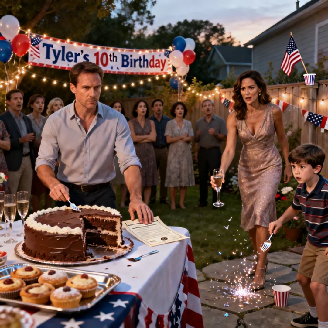 Behind them, the backyard glowed with expensive string lights, custom banners that screamed TYLER TURNS 10!, and a crowd of at least forty guests—neighbors, cousins, coworkers, friends from the country club.
