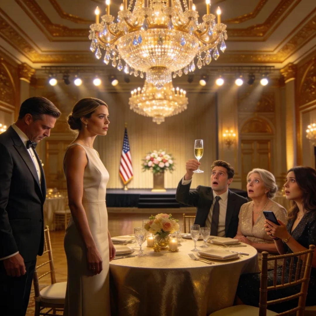 Not because someone dropped it—because the crystal chandelier above Ballroom A of the Grand Plaza Hotel caught the light at the perfect angle and sent a blade of brightness straight into the glass, turning it into a glittering prism for one suspended heartbeat. For a second, the whole room looked like it had been sliced open. Like the night itself had a seam.