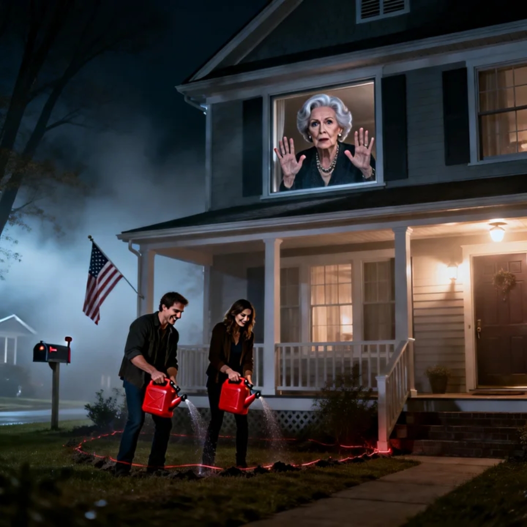 The lock clicked from the outside like a finishing touch on a coffin, and through the thin lace curtain I watched my daughter-in-law—sweet smile, perfect manicure—tilt a red gas can and draw a shiny wet ring around my home as calmly as if she were watering roses.