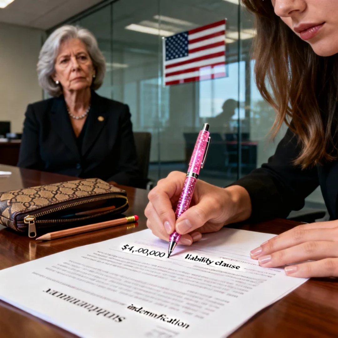 Not metaphorically. Not as some poetic detail I’m adding now. She literally reached into a Louis Vuitton pencil pouch—one of those tiny, shiny things you’d expect to hold lip gloss, not legal obligations—clicked the pen like it was a fidget toy, and scrolled her name across a clause that read “$4,000,000 liability cap” as if she were autographing a yearbook. While she did it, she hummed along to a TikTok sound about margaritas and manifesting.