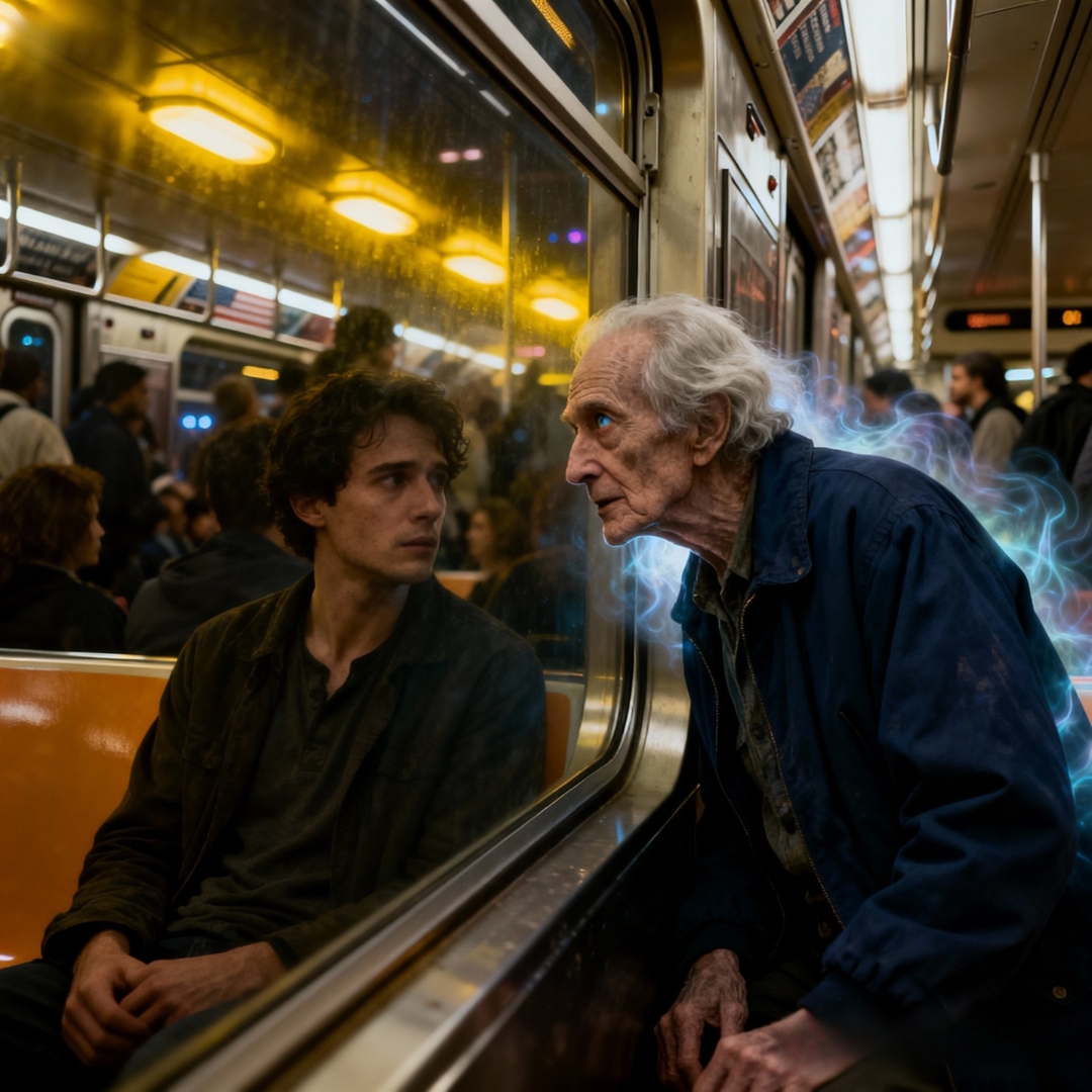The man next to me looks like someone’s grandfather. Gray hair combed back, warm brown skin, deep lines at the corners of his eyes. He’s wearing a navy-blue coat that’s a little worn at the cuffs, and he’s got that look some older people in New York get—a mix of city toughness and something softer underneath.